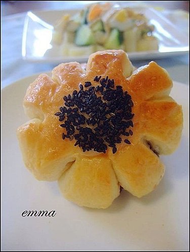 『麻媽~這麵包好像向日葵喔,有好多黑黑的~小小的種籽喔!』那天臭妹看著烤出爐的紅豆蜜包時這麼說。